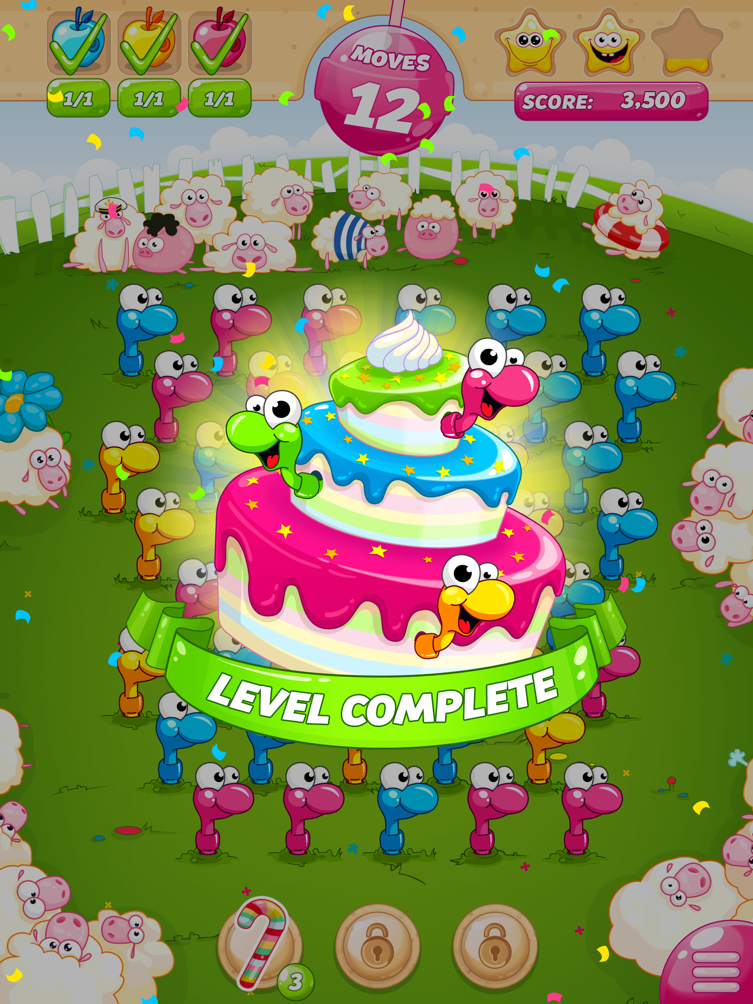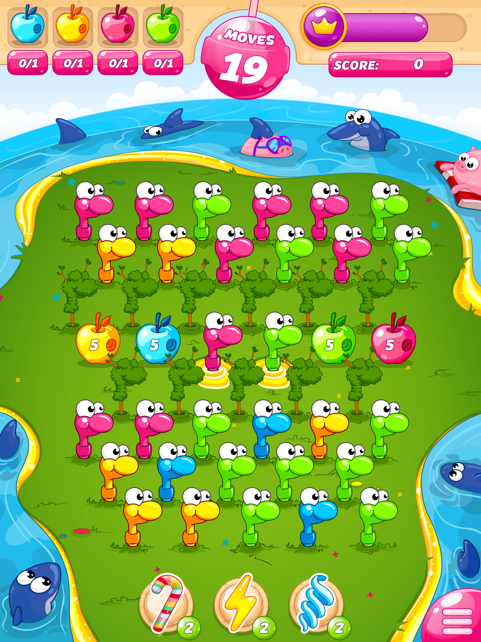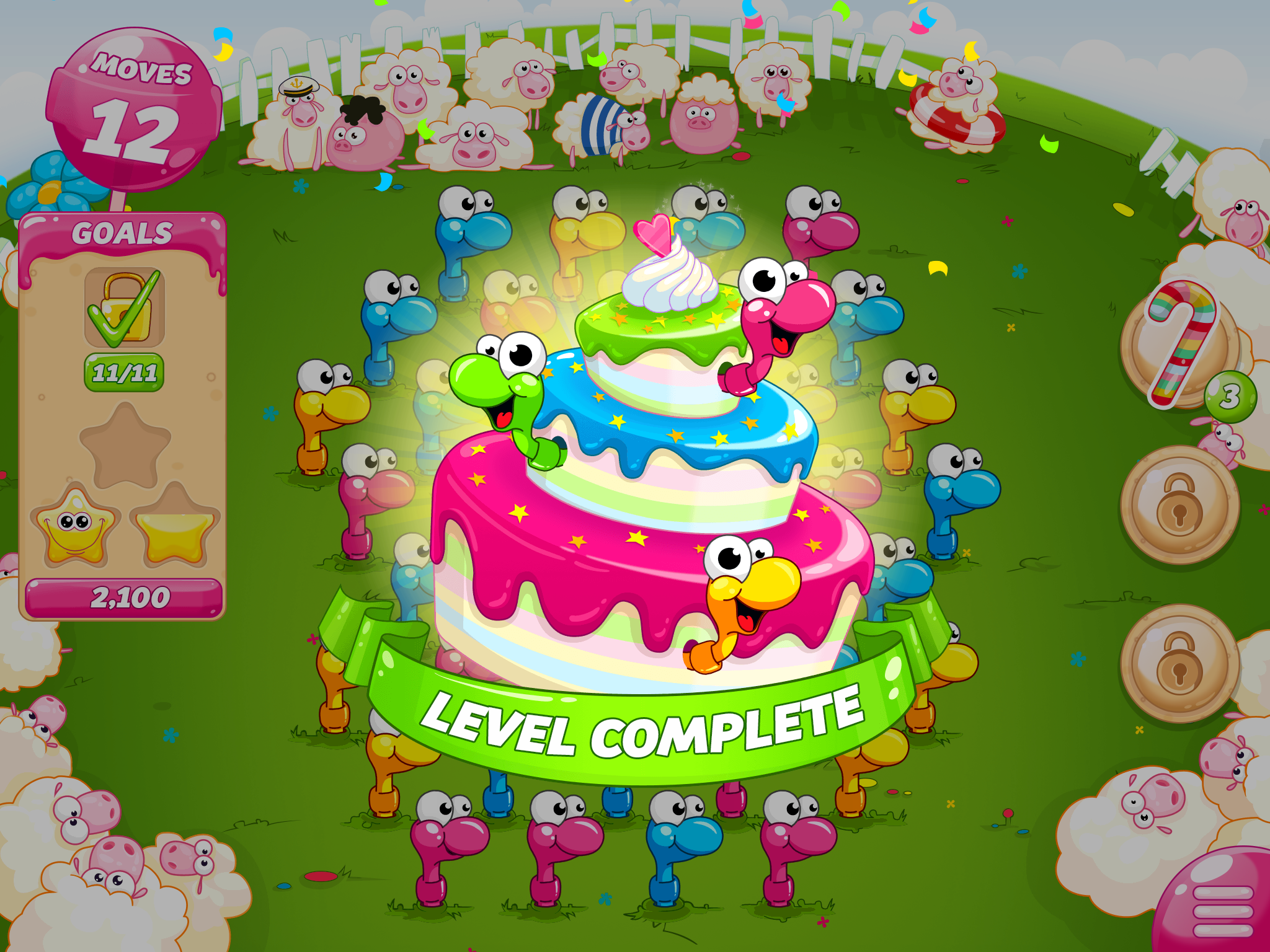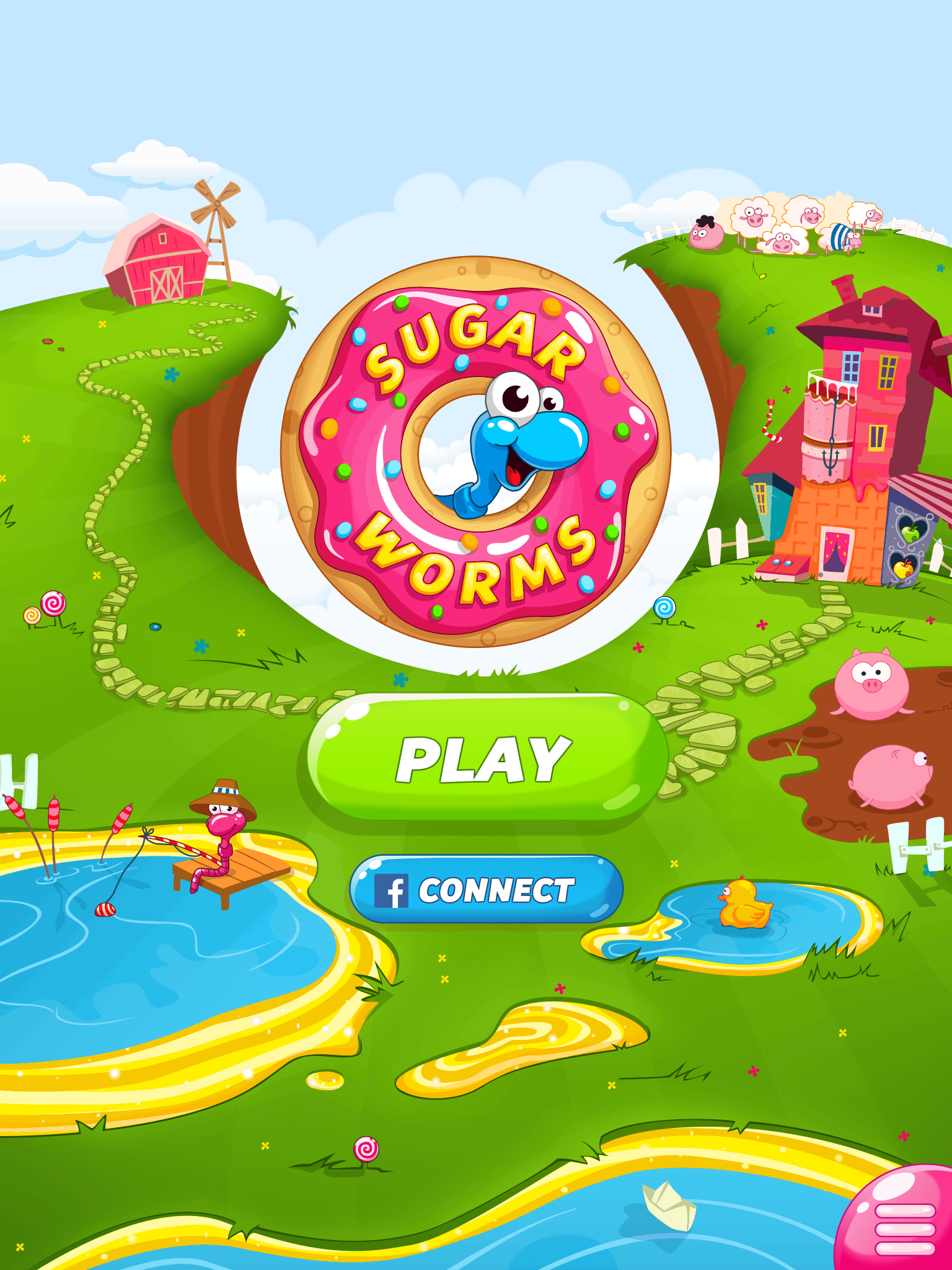 DESCRIPTIONSugar Worms is a casual, free-to-play puzzle mobile game, introducing never seen before twists of the popular line-matching gameplay. The game sees players connecting worms to remove them from screen and get them replaced by new worms that appear in their place. This is in contrast to the usual gravity that is used to reorder the field and proved to be much more addicting for laying greater emphasis on the element of luck. As a result players are now allowed to make a move before the previous one has finished, getting over the most tedious restriction that usually slows down the gameplay of other puzzle games. HISTORYThe worms, the main characters of the game, were originally created for another game that was in the works where they were going to play a supporting role but the team loved them so much that they decided to dedicate them their own game. Aiming for the best possible interaction with the worms the team ended up with the line-matching mechanic. The game was soft launched for 4 months in Canada, New Zealand and several other territories during which time based on the input of the players were added some of its most distinctive features, the Champion mode and the Trophy levels. FEATURES